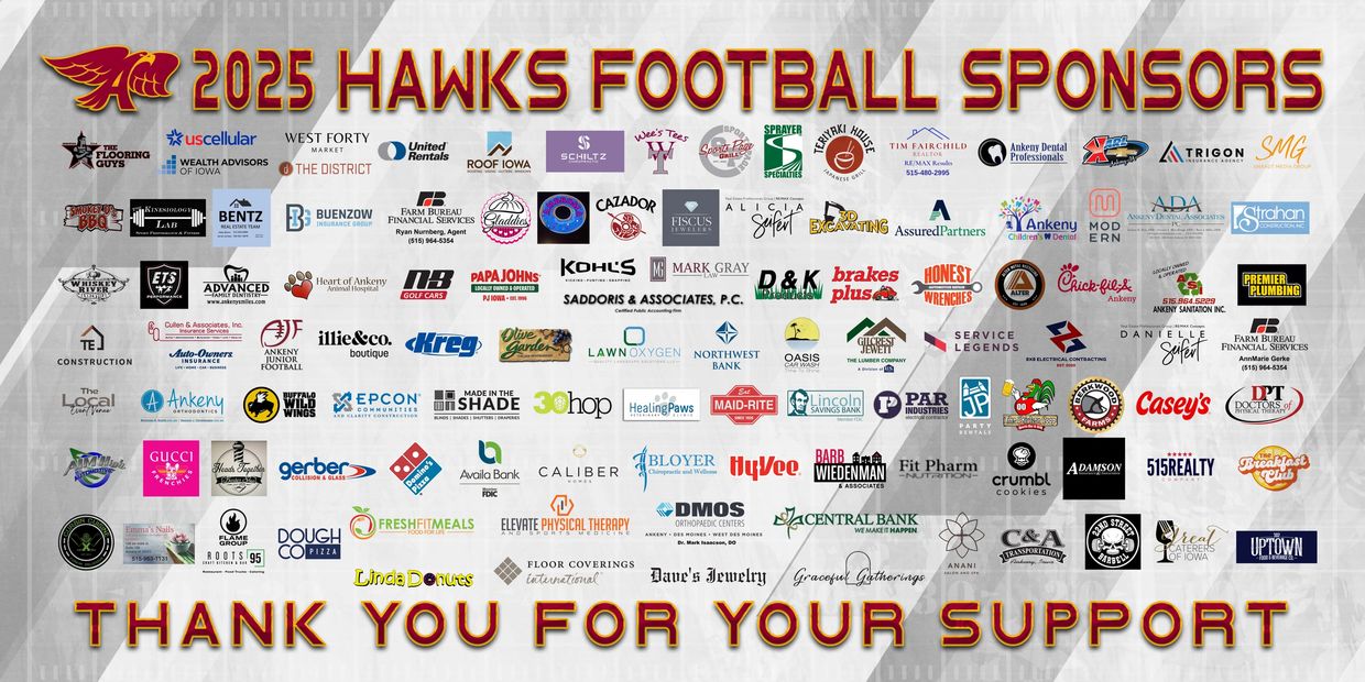 The entire Hawks Football Committee wants to thank you for taking the time to consider being an Ankeny Hawk Football Sponsor. We look forward to hearing from you soon.